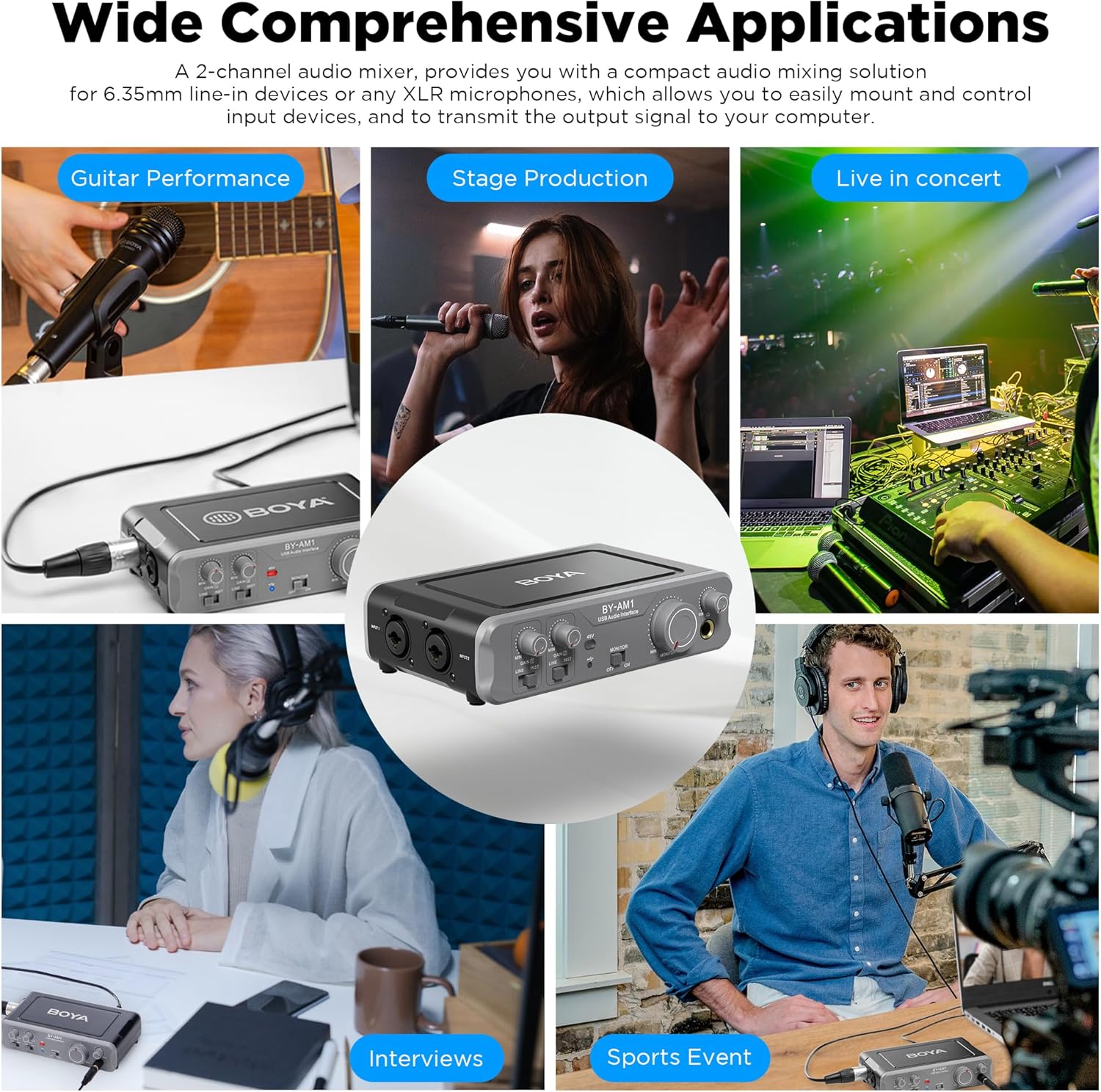BOYA Audio Interface for for The Guitarist, Vocalist, Podcaster, Producer 44.1k-192kHz High-Fidelity Audio Mixer for Recording, Streaming Computers Microphone with XLR/6.35MM/48V Phantom Power by-AM1